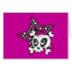Niedlicher Emo-Stil Schädel und Kreuzknochen mit Bogen ist Set auf einem lila und schwarzen Stern mit weißen Polka Punkten.