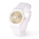 Diese minimalistische Fußballuhr weist eine goldene Fußball-Grafik auf, die eine schicke, digital geschaffene Textur mit dunkleren Bereichen aufweist, die typisch schwarze Paneele eines Fußballballs darstellen, und weiße Nähte zwischen den Panels - die mit ihrem Namen und ihrer Monogramm- oder Jerseynummer - von katz_d_zynes