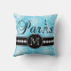 Dieses schwarze und girly blaue Chic Throwkissen mit Vintagem Damastmuster und personalisiert Ihre Monogramminitiale, das Wort "Paris" mit dem Eiffel-Turm und eine Schriftzeile weiße Diamanten auf einem schwarzen Band schaut in Ihrem Schlafzimmer oder in Wohnzimmer als Akzentkissen fantastisch. Monogramm-Galerie Gifts© Elke Clarke entwirft ©