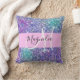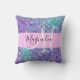 Glam lila, blau und grün Glitzer Glitzern monogramm Name und erste werfen Kissen. Individuelle Name und Monogramm sind in einem handgeschriebenen, eleganten Skript mit hellrosa Hintergrund geschrieben. Sie können die Textfarbe, den Schriftart und die Schriftgröße mit der Option Anpassen ändern.