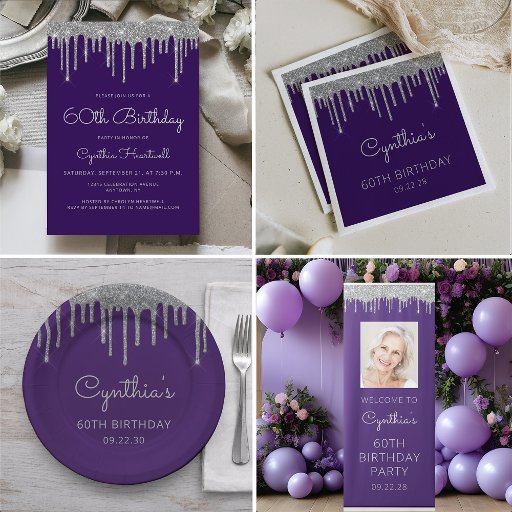 Glam Purple Silver Glitter Drip 60th BirthdayDesignt von Akhates Designs