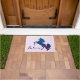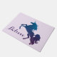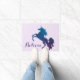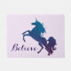 Eine Türmatte, die einen schönen lila und blauen aufrichtenunicorn kennzeichnet. Das Bild ist Set auf einem sehr hellpurpurnen Hintergrund. Der Text "glauben, dass" Set beim Zusammenbringen lila unter Verwendung des trendy Schriftartes ist.
