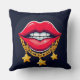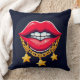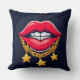 Eine lebhafte Abbildung mit leuchtend roten Lippen, die auf blauem Hintergrund mit gelben Sternen geschmückt sind und ein Gefühl der modernen, künstlerischen und kühlen Ästhetik hervorrufen.