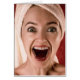 Eine Frau trägt ein Tuch um ihren Kopf nach einer Dusche und öffnet ihren Mund weit in der Aufregung. Wer sich interessiert, was die Gelegenheit ist! Diese Karte passt jede glückliche Gelegenheit!