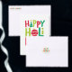 Mit dieser farbenfrohen Einfotokarte, die lustige und spielerische Illustrationen als Teil des Wortes "Happy Ferien" enthält, können Sie fröhliche und helle Urlaubswünsche senden