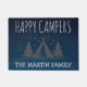 Niedliche, personalisierte RV-Campingsdekorfußmatte für rvers, pensionierte Paare und Camper begrüßen Fußmatte lasen "glückliche Lagerbewohner" in handgeschriebenem schauendem Druck, weiße Buchstaben an der Spitze mit einer Textschablone für das Hinzufügen des Familiennamens an der Unterseite. Mit einer einfachen, dunkelgrauen Illustration eines Teepeeart-Campingszeltes nachts umgeben durch Kiefernbäume und Sternen. Gegen Foto des dunkelblauen, starry Himmelhintergrundes. Großes Paarruhestandsgeschenk, auch. Würde zu Hause vor einem RV oder einem gemütlichen Blockhaus im Holz recht schauen.