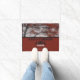 Niedliches Geschenk für rvers, pensionierte Paare, die wie, um auf die Straße, die Wanderer, die Camper und das Natur lovers> zu reisen diese personalisierte Campingsfußmatte glückliche Lagerbewohner-lebenabenteuer seit dem mit einer DIY Textschablone für das Addieren des Familiennamens und des Jahres las. Gegen einen Ziegelsteinrothintergrund und schönes ein Natur-Foto eines Baums und sein brennendes rotes Herbst-Blätter mit einem unscharfen bokeh fokussieren Sie. Großes Ruhestandsgeschenk, auch. Seien Sie zu Hause vor einem RV oder einem gemütlichen Blockhaus recht.