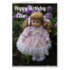 Herzlichen Glückwunsch zum Geburtstag Ella-Text auf einer schönen Karte mit hübscher Puppe und violetten Blumen
