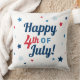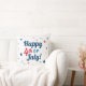 Stilvolle patriotische Amerikanische Unabhängigkeitstag-Urlaubskissengestaltung mit einem "Happy 4. Juli" Zitat Schrift Schriftbild Textgestaltung in Rot, Weiß, Blau und Marineblau mit Sternakzenten und weißer Hintergrundfarbe.
