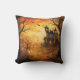 Landschaftliche Halloween-Kissen zeigen eine KI-Grafik eines Spuk Herrenhauses mit leuchtend orangefarbenem Himmel, Fledermäusen und beängstigenden Totenbäumen.