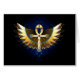 Golden ägyptischer Knöchel mit gemusterten, glänzenden Flügeln auf schwarzem Hintergrund. Magisches Symbol.