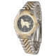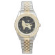 Eine glänzende goldene Silhouette Bernese Mountain Dog ist das Herzstück dieser eleganten Uhr. Das Hundebild wird durch die Zuordnung von Goldzahlen gerahmt, und das drei Buchstaben-Monogramm ist oben rechts. Alles wird auf einem dramatischen schwarzen Hintergrund platziert. Ideal für alle, die einen Berner Lieben.