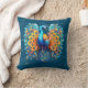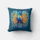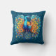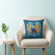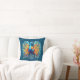 Dieses farbenfrohe Kissen besticht durch einen wunderschönen Pfauenvogel in vorherrschenden Blau- und Goldtönen. Der Pfau hat seine Flügel verteilt, um das bunte Muster auf ihnen zu zeigen. Das Bild wird auf einem dunkelblauen Hintergrund mit goldenen Konfetti-Spritzern platziert. Beide Seiten des Kissens haben das gleiche Design.