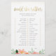 Ein bearbeitbares Brautparty-Spiel, bei dem die Gäste die Wahl, die sie für die Braut zu wählen denken, Karo nehmen müssen. Die Person mit den korrektesten Punkten gewinnt! Dieses Design zeichnet sich durch elegante Schriftzeichen, Imitate mit Goldfolie und eine rosa Blumenstruktur am Seitenrand aus. Karten kehren zu einem wunderschönen Muster derselben Aquarellfarben-Blume zurück. Sehen Sie sich die auf dieser Seite verlinkte Kollektion an, um die passende Brautparty-Schreibwaren zu finden, oder besuchen Sie unseren Shop für weitere Brautparty-Spiele.