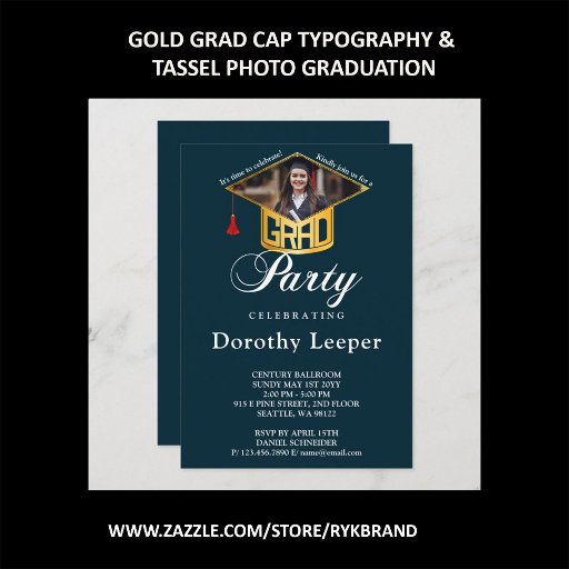 Gold Grad Cap & Foto Abschluss Einladung. "Feiern Sie Ihren Abschluss mit dieser eleganten, modernen Graduiertenkappe und dem Tassel Foto Abschluss Einladung. Die Karte zeichnet sich durch eine bescheidene, elegante Graduierungskappe mit einer schönen Tassel und einem minimalistischen und dennoch stilvollen Stil aus. Das Wort "Grad" ist elegant typografisch auf dem Boden der Kappe aufgedruckt und verleiht ihr einen unverwechselbaren Look. Ein Foto der Absolventen, das ihren einzigartigen Augenblick einnimmt, kann auf die Kappe gelegt werden. Das Foto ist von einer goldenen Grenze umgeben. Die Jahre werden durch die Tassen repräsentiert. Fügen Sie die Namen Ihres Absolventen und der Schule, die sie besucht haben, um diese phantastische Karte zu personalisieren. Es ist der perfekte Weg, um an einen wichtigen Anlass zu erinnern und den spannenden nächsten Schritt ihrer Bildungsreise bekannt zu geben!"