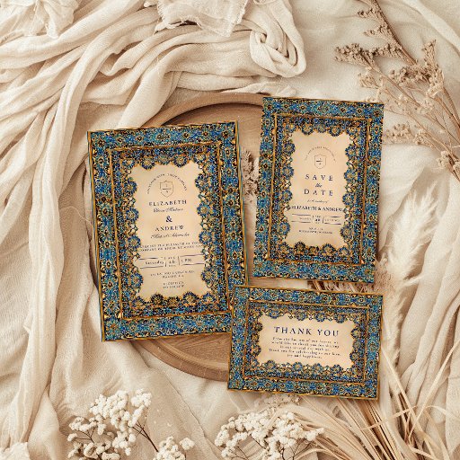 An elegant design inspired by traditional Islamic art, featuring a luxurious mosaic tile border in shades of sapphire, gold, and ivory. Perfect for a refined and meaningful Islamic wedding, this timeless piece captures the beauty of sacred geometry and cultural heritage with a touch of modern sophistication.