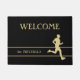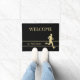 Ein Goldlader ist unten rechts von dieser Türmatte. Dünne goldene Linien umrahmen Ihren Familiennamen oder anderen benutzerdefinierten Text in passendem Gold, und das obere Textfeld, das ebenfalls anpassbar ist, sagt derzeit WELCOME. Bild und Text werden auf einem schwarzen Hintergrund platziert.