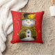 Ein festliches Kissen mit einem skurrilen Schneemann in goldenem Samtkopfteil und -weste, umgeben von goldenen Sternen und einem farbenfrohen, roten Hintergrund, um Ihrem Urlaubsdekor und der Weihnachtsdekoration eine einzigartige, designvolle Touch zu geben.