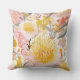 Blumenkissen mit markanten goldenen Banksia Blüten mit grauem Blattwerk und rosa Blume in einem Design, das erdige Töne mit subtilen blumigen Highlights abwägt.