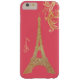 Glam iPhone 6 Plus Gehäuse, mit einem glitzernden goldfarbenen Glitzer, der die Silhouette des Eiffelturms ansieht, vor einem korallenrosa Hintergrund. Personalisieren Sie den gelben Goldtext für sich selbst oder als eine großartige Geschenkidee.