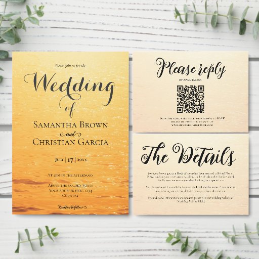 Golden orange Sommermeere Wellen Hochzeit. Hochzeitskollektion für eine Sommerhochzeit am Strand mit einem Foto goldgelber Orangenwellen bei Sonnenuntergang mit einer atemberaubenden Farbe von weich gelb bis hellorangefarben. Alle Informationen zum Produkt können durch Klicken auf "Diese Vorlage personalisieren" vollständig angepasst werden. Wenn Sie gewollt haben, die Größe des Schriftartes zu ändern oder einige Dinge zu verschieben, können Sie dies erreichen, indem Sie auf "Bearbeiten mit dem Designwerkzeug" klicken. Sie können mich immer bezüglich des Designs kontaktieren, indem Sie unten auf "Nachricht" klicken.