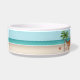 Desteis originelle Cartoon-Illustration einer niedlichen Rothaarfarbe Golden Retriever Hund stehend in einer tropischen Sommer Strand-Szene. Der beige Sand ist mit Palmen, rosa Muscheln, Seestern und einer roten Krabbe bedeckt. Das Wasser ist türkisblau mit einigen Wellen und die Sonne scheint über dem Horizont. Es gibt auch einen personalisierbaren Textbereich für einen Namen oder anderen benutzerdefinierten Text wie "Essen" oder "Wasser".