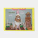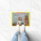Auf dieser Türmatte befindet sich ein goldenes Retriever-Mädchen, das in einem Karottenpflaster Möhren pflückt und ein goldenes Retriever-Kaninchen, das die Möhren frisst. Die Nachricht lautet: "Hoppy Oaster!"
