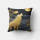 Ein majestätischer goldener Wolf steht an einem windgekehrten Ufer, heult auf einem leuchtenden Vollmond, während ein einsamer Vogel über ihm fliegt und so eine mystische Atmosphäre schafft.