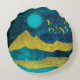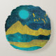 Abstraktes Gebirgslandschaftsdesign in kühnen Goldtönen, Zyantönen und Blau mit einem Mondschein, Sternen und Vögeln.