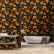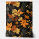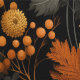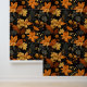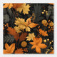 Ein auffallendes herbstorientiertes Design mit fett-goldgelben und blassorangen Blätter Set vor schwarzem Hintergrund. Die komplizierten Details der Blätter, zusammen mit der subtilen Aufnahme von Beeren und Farnen, schaffen ein Gefühl von Wärme und Textur. Das dunkelgrüne und graue Blattwerk verleiht dem Ganzen Tiefe, die lebhaften Herbstfarben heben sich ab und verkörpert das Wesen der Herbstsaison mit Eleganz.