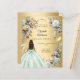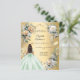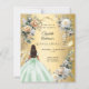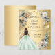 Ein Imitat goldener Hintergrund. Weiße und gelbe Blumen, schlaue grüne Vegetation, goldenes Band. Ein Mädchen mit einem Tiara und einem grünen Kleid. Personalisieren und fügen Sie einen Namen und Details. 1 Blatt = 1 Einladung mit Druckkante bis Kante.