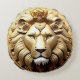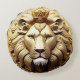 Detaillierte künstlerische Darstellung eines regalen Löwen mit einer Krone auf einem kreisförmigen goldenen Emblem, das Stärke, Adel und königliche Autorität repräsentiert.