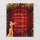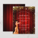 Eine moderne, stilvolle und glamouröse Einladung für eine Quinceañera, 15. Geburtstagsfeier, Hollywood Thema. Ein roter Hintergrund mit Imitaten goldenen Glitzer Staub, ein Mädchen mit einem goldenen Kleid. Ein roter Filmvorhang als Hintergrund Der Name ist mit einem modernen handgeschriebenen Stift geschrieben. Personalisieren Sie Ihre Party-Daten und fügen Sie sie hinzu.