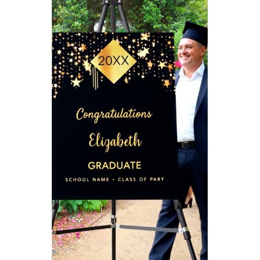 Ein schwarzer Hintergrund mit goldenen Sternen aus der Rose und einer Kappe. Personalisieren und fügen Sie einen Namen, Party-Details und Jahr. Der Abschluss und der Name sind mit einem modernen, handgeschriebenen Stil geschrieben.