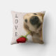 Fügen Sie ein wenig goldenes Glück Ihrem Zuhause hinzu! Dieses Throwkissen kennzeichnet eine Fotografie eines niedlichen Hundes des goldenen Retrievers, der eine Single-Rote Rose in seinem Mund hält. Text liest, "Liebe," aber diese zum Anzug gelöscht oder personalisiert sein kann Ihr Bedarf! Vervollkommnen Sie für Valentinstag oder jeden möglichen Tag an allen!