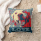 Dieses Kissen kennzeichnet eine Nahaufnahme eines lächelnden Hundes des goldenen Retrievers, getan in der "Hoffnungs" Schabloneart mit den roten, weißen und blauen Farben, zusammen mit der Wort-Liebe.