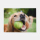 Ein naher Schuss eines Golden Retriever mit einem gelben Tennisball im Mund.