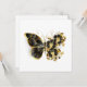 Goldener Schmetterling mit schwarzem Schmuckorchid, mit goldenen Blätter auf weißem Hintergrund dekoriert.