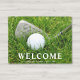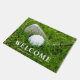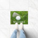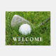 Individuelle Golftür mit einem Golfclub und einem Ball auf grünem Gras. Verwenden Sie die Online-Vorlagenfelder, um eine Personalisierung mit Ihrem Familiennamen vorzunehmen.