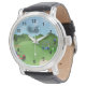 Diese Golfanlage verfügt über einen Golfplatz mit Sandfalle und Golfflagge, einen roten Golfwagen, einen blauen Golfwagen, beide mit Golftaschen. Dekorativer Text ist Golf. Die Uhrennummern können gelöscht werden, wenn Sie Ihre Uhr ohne sie bevorzugen. Perfektes Geschenk für den Golfer in Ihrem Leben. Wählen Sie den Stil und die Farbe Ihrer Uhr! Dieses Design wurde unter Verwendung von Original-Artwork© www.delightful-doodles.com