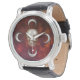 Goth Magik Vintage Skull Illustration mit vier silbernen Wappen Monden auf rotem Himmelshintergrund.