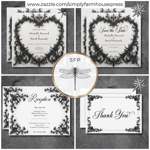 Gothic Black & White Filigree Heart Wedding Einladung