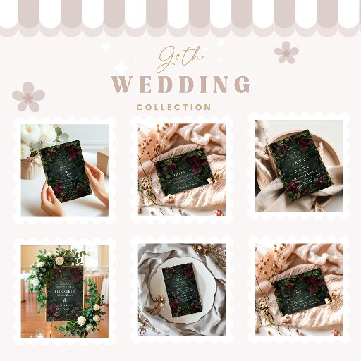 Dieses verzierte, dunkle Blumendesign vereint die Eleganz eines Viktorianischen gotischen Gartens mit tiefburgundischen Blüten, üppiger Vegetation und einem goldenen Rahmen. Ideal für Herbst- oder Winterhochzeiten, erinnert es an eine geheimnisvolle und luxuriöse Atmosphäre für Paare, die Vintage Dramatik, Opulenz und zeitlose Schönheit Liebe.