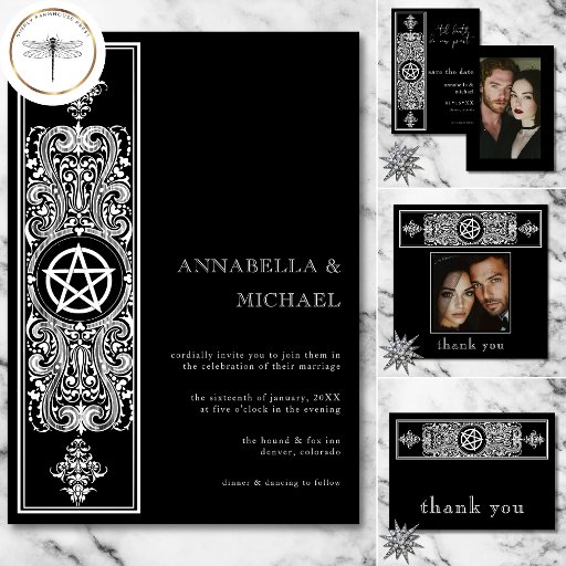 Feiern Sie Ihre ewige Liebe mit einer Hochzeitseinladung, so kühl und unvergesslich wie Ihre Bindung. Dieses Design mit einem dramatischen schwarzen Hintergrund, einer eleganten gotischen, weißen Grenze und einem Pentagram-Sternmotiv Set den Ton für eine romantische und geheimnisvolle Nacht. Ideal für Paare, die es wagen, die Schönheit der Dunkelheit und die Tiefe des wahren Engagements zu genießen. Erstellt von der einfachen Farmhouse Press.