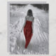 Gotisches Vintages Mädchen mit rotem Kleid, das im Winterwald-Scrapbook-Papier läuft. Dieses 110-lb-Papier kann für Ihr Foto-Album, Handwerk oder Entkopplungsprojekte verwendet werden, die schwerere Papiere benötigen. Grau, schwarz und weiß. Bildrecht Marg Seregelyi Fotografie.