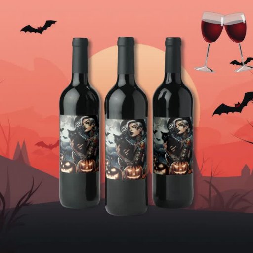 Aufkleber aus Halloween-Party. Nimm deinen Besen und fliege rüber! Eine göttliche gotische Tätowierung mit einer schwarzen Katze, Fledermäuse und Vollmond-Grafik.