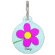 Dieses Ausrüstungsbeschreibungen ein grafisches rosa Gänseblümchen auf einem blauen Hintergrund. Fertigen Sie diesen Umbau mit dem Ihrem Namen und der Ihrer persönlichen Information des Haustieres besonders an.