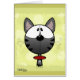 Das niedliche Gesicht einer Cartoon-Graukatze wird mit einem roten Halsband und gelbem Hintergrund mit dunkleren gelben Rahmen gesehen. Originelles Design von Christie Black von Kreationen aus dem Herzen.