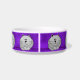Diese personalisierte Haustierschüssel der niedlichen kundenspezifischen Keramik hat wunderliche graue fette Cartoonkatzen, mit seinen Tatzen, die darunter verstaut werden und seinem Schwanz zu sitzen, der herum, auf einem lila Hintergrund eingewickelt wird. Es gibt mehrere von ihnen um den Teller.