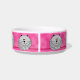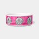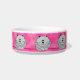 Diese personalisierte Haustierschüssel der niedlichen kundenspezifischen Keramik hat wunderliche graue fette Cartoonkatzen, mit seinen Tatzen, die darunter verstaut werden und seinem Schwanz zu sitzen, der herum, auf einem rosa Hintergrund eingewickelt wird. Es gibt mehrere von ihnen um den Teller.